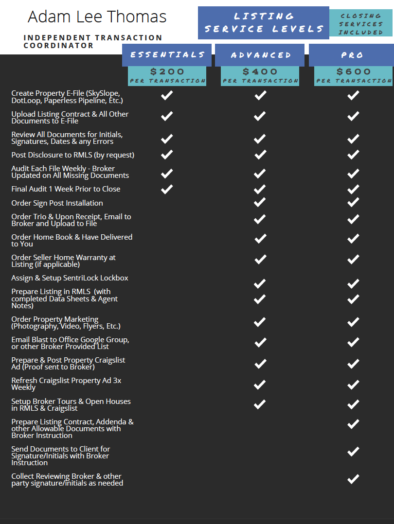 Review the service levels below and find a plan that closely fits your wants, needs, and future goals. Make note of any questions you may have as you review each service within the plans. I can tailor a plan that fits your needs, and my add-on services coupled with my knowledge of the industry, make me your one stop virtual real estate concierge.