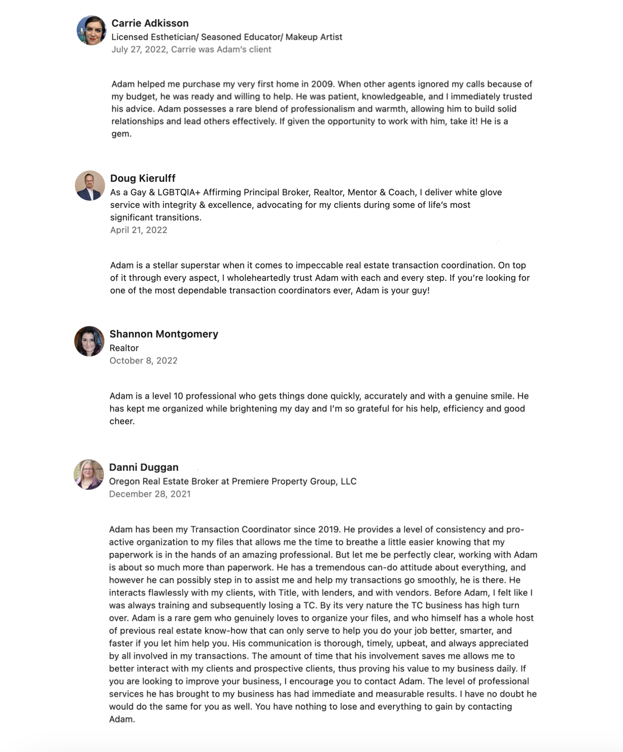 Many real estate brokers are busy and looking for ways that they can get more of their personal time back by simplifying and improving their business processes. Many are in a place that they really need the extra help at different times throughout the year, but don’t have time to manage an employee, and don’t want to pay for extra office space or payroll. If you or someone you know may be looking for help in this way, I'd be happy to set up a time to chat about how I can help streamline your/their business.